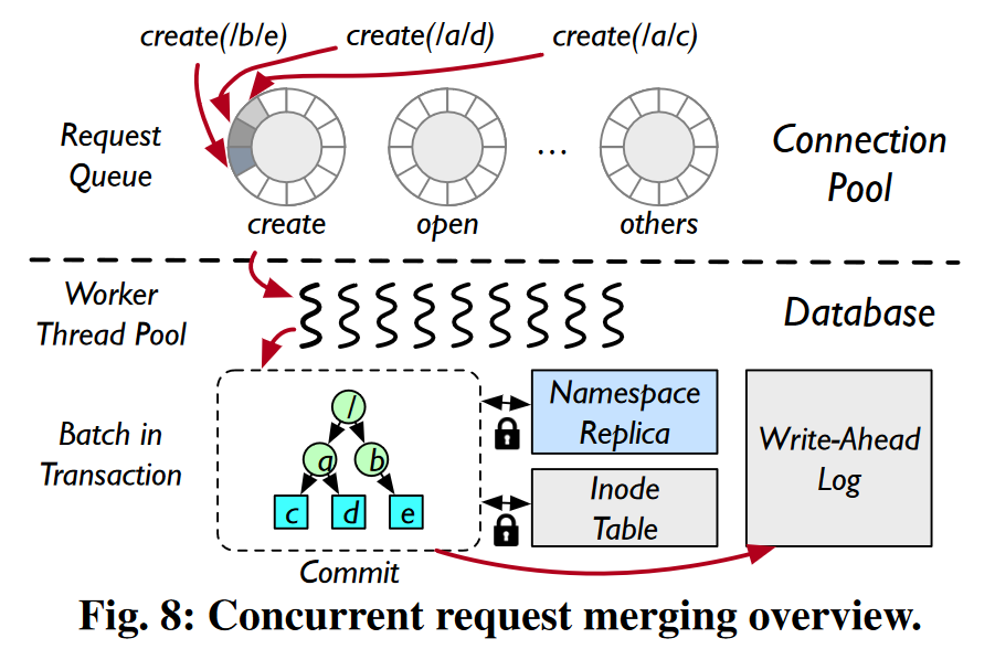 rmdir(/b)请求发送给Coordinator。Coordinator先获取所有祖先目录的共享锁和目标目录的互斥锁,然后将请求转发给该目录的所有者(MNode 0)。MNode 0先对/b上锁以阻塞后续的lookup请求,并向其他MNode广播一个无效请求。收到请求后,每个MNode无效化本地的相应dentry,并搜索inode表,查询该目录的孩子,并向MNode 0返回是否存在孩子。MNode 0则负责聚合这些响应信息。若没有孩子,MNode 0会删除对应的inode,并通知Coordinator。而Coordinator则会释放所有的锁,并回应客户端。否则,MNode 0返回-ENOTEMPTY,终止rmdir操作。每个元数据服务器会初始化固定数量的数据库工作线程,并准备好一个连接池。根据请求类型不同,连接池会将请求放到对应的请求队列中。空闲工作线程检索队列,并在一次事务中执行队列中的所有请求。