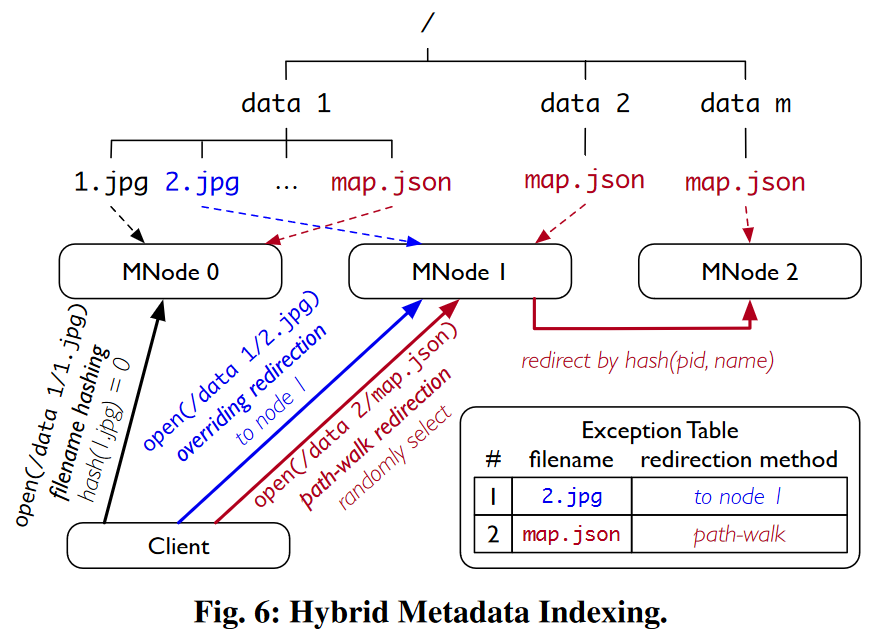 针对热门文件名的路径游走重定向(path-walk redirection):客户端随机选择一个MNode发送请求,接收节点同时使用父目录ID和文件名执行哈希操作hash(pid, name),将请求重定向到目标节点上。